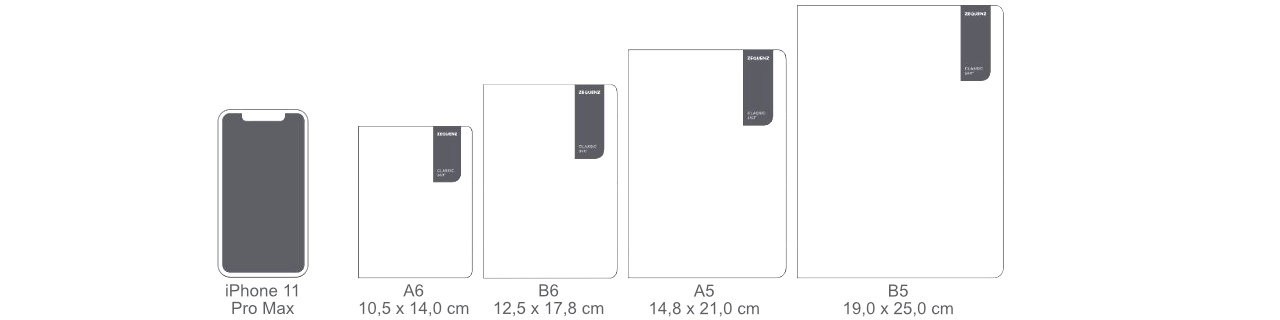 Signature Classic A6- Größe: 9,0 x 14,0 x 1,5 cm Material: PU und weißes Papier Lineatur: Blanko – 100 g/m², 170 Seiten, 85 Blatt Liniert – 70 g/m², 256 Seiten, 128 Blatt Kariert – 70 g/m², 256 Seiten, 128 Blatt Signature Classic A6 Größe: 10,5 x 14,0 x 2,0 cm Material: PU und weißes Papier Lineatur: Blanko – 100 g/m², 280 Seiten, 140 Blatt Liniert – 70 g/m², 400 Seiten, 200 Blatt Kariert – 70 g/m², 400 Seiten, 200 Blatt Signature Classic B6 Größe: 12,5 x 17,8 x 2,0 cm Material: PU und weißes Papier Lineatur: Blanko – 100 g/m², 280 Seiten, 140 Blatt Liniert – 70 g/m², 400 Seiten, 200 Blatt Kariert – 70 g/m², 400 Seiten, 200 Blatt Signature Classic A5 Größe: 14,8 x 21,0 x 2,0 cm Material: PU und weißes Papier Lineatur: Blanko – 100 g/m², 280 Seiten, 140 Blatt Liniert – 70 g/m², 400 Seiten, 200 Blatt Kariert – 70 g/m², 400 Seiten, 200 Blatt